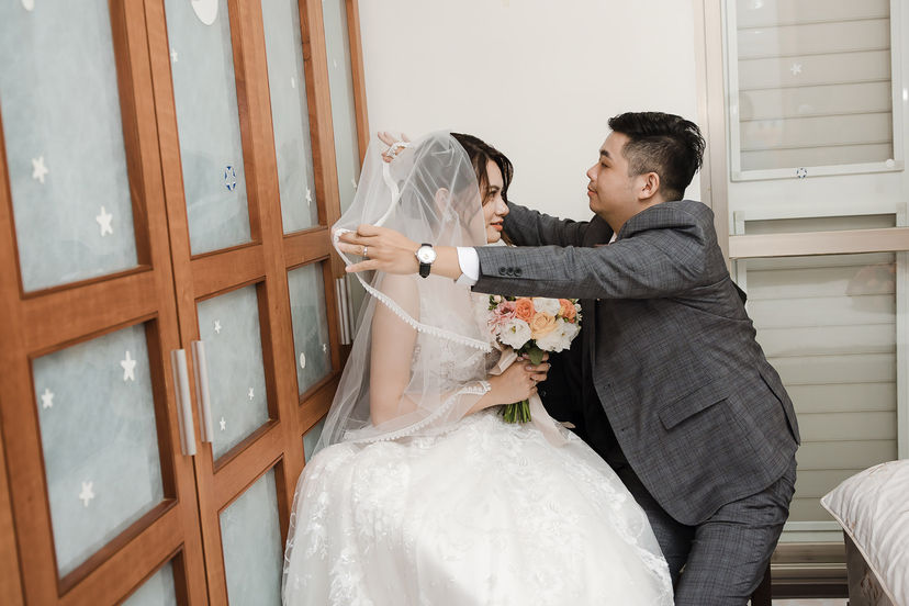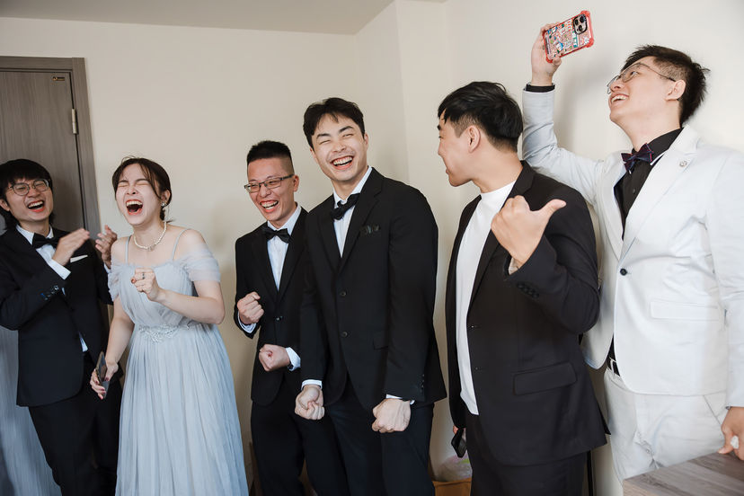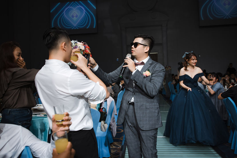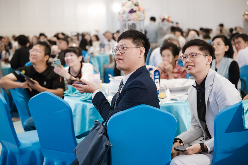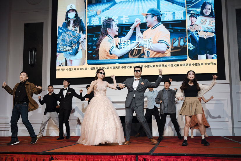 而舞台燈光一打下來,新郎新娘笑著牽手出場全場歡呼